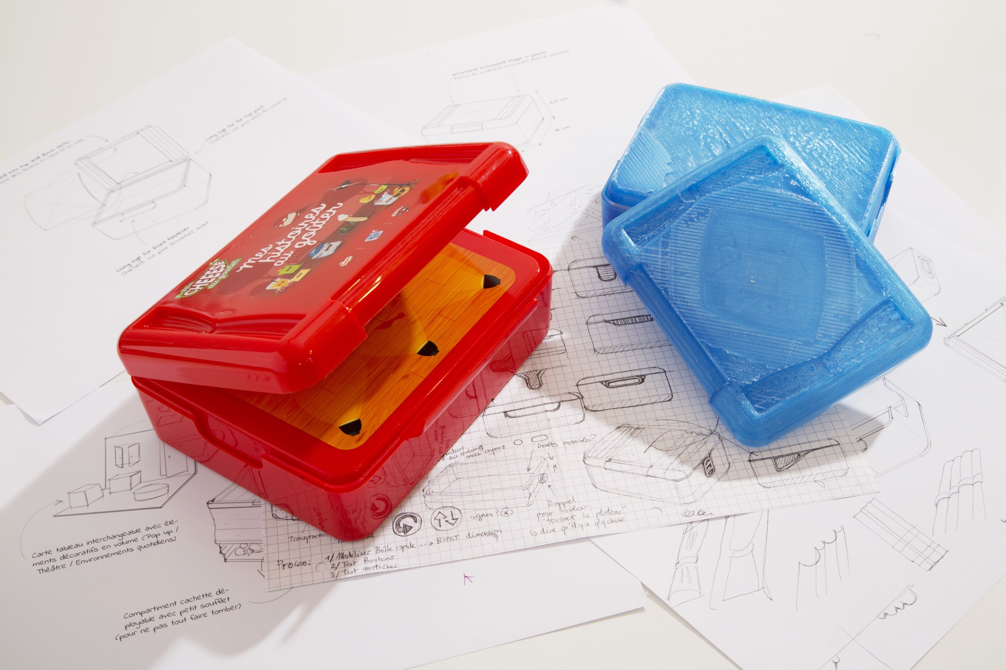We worked in the plastic to find simple and inexpensive solutions. The box consists of an inside secret compartment and turns into a mini-theater to make children's snack fun and friendly.