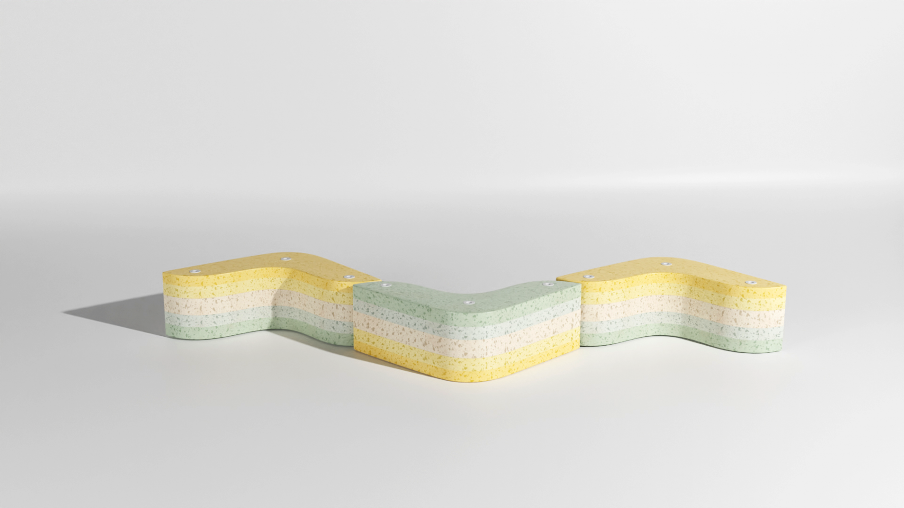 EVA, a material generally produced in Asia, is recycled in France using various regional resources. It is reconditioned, stretched, vulcanized, and cut in boomerang panels. These are assembled by the user by threaded rods, so the object can be easily disassembled for repair and recycling after normal use.
